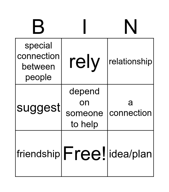 This bingo card has 9 words: friendship, relationship, rely, suggest, special connection between people, a connection, depend on someone to help, idea/plan and Free!.
