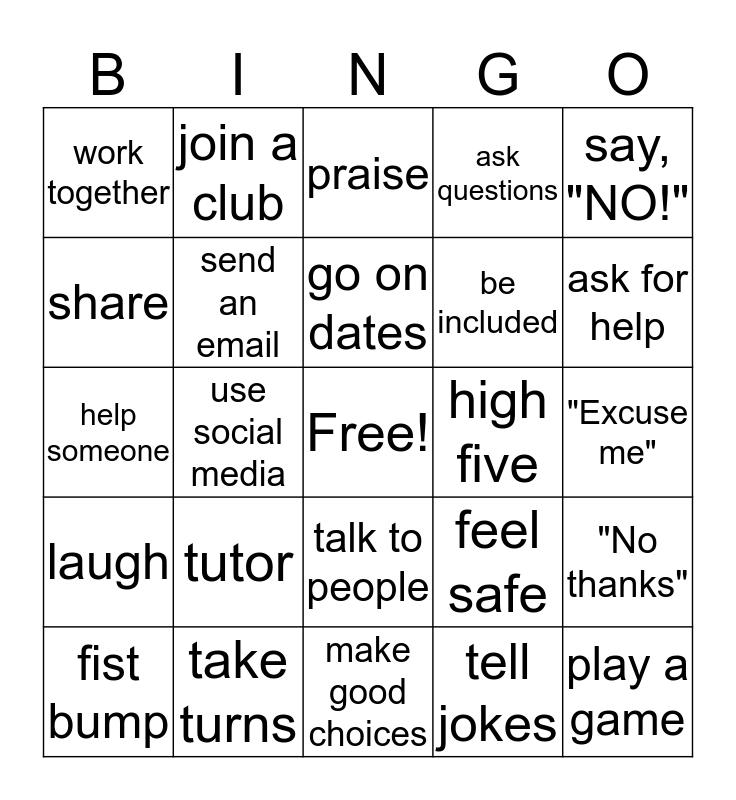 This bingo card has a free space and 24 words: tutor, take turns, go on dates, fist bump, say, "NO!", work together, share, join a club, high five, talk to people, be included, help someone, feel safe, "No thanks", send an email, tell jokes, "Excuse me", praise, ask for help, use social media, play a game, laugh, ask questions and make good choices.