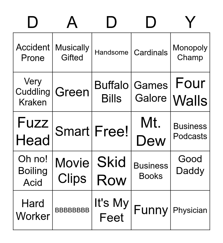 This bingo card has a free space and 24 words: Movie Clips, BBBBBBBB, Buffalo Bills, Hard Worker, Monopoly Champ, Accident Prone, Very Cuddling Kraken, Musically Gifted, Mt. Dew, Skid Row, Games Galore, Fuzz Head, Business Books, Good Daddy, Green, Funny, Business Podcasts, Handsome, Four Walls, Smart, Physician, Oh no! Boiling Acid, Cardinals and It's My Feet.