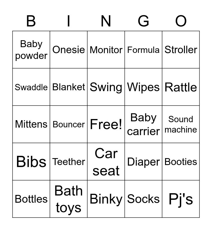 This bingo card has a free space and 29 words: Bottles, Diaper cream, Bouncer, Diaper bag, Baby powder, Monitor, Blanket, Teether, Baby carrier, Bath toys, Sound machine, Pj's, Binky, Socks, Rattle, Crib, Car seat, Bibs, Stroller, Mittens, Diaper, High chair, Wipes, Swaddle, Formula, Onesie, Booties, Swing and Changing table.