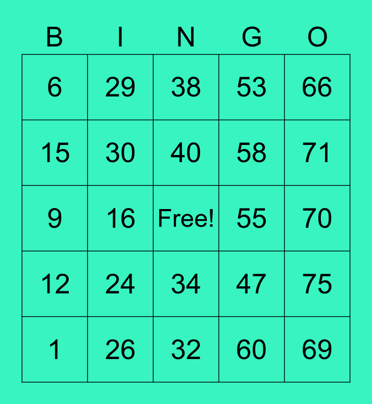 This bingo card has a free space and 24 words: 1, 24, 40, 60, 66, 6, 29, 38, 55, 70, 9, 30, 47, 75, 15, 26, 32, 53, 71, 12, 16, 34, 58 and 69.