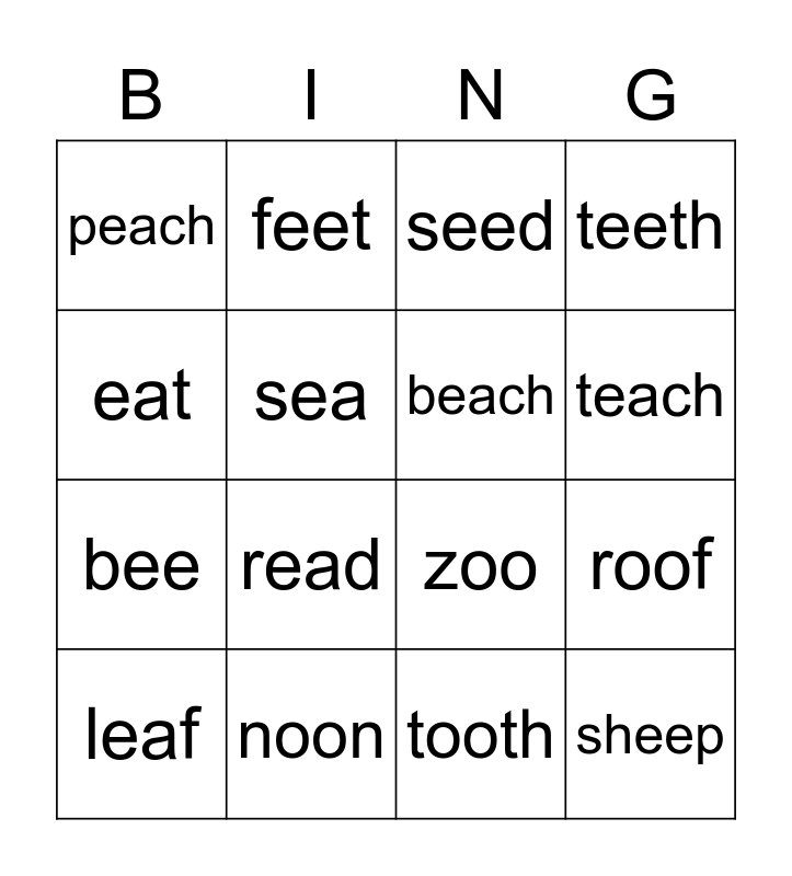 This bingo card has 16 words: noon, roof, seed, peach, bee, feet, zoo, tooth, eat, sea, leaf, teeth, read, teach, beach and sheep.
