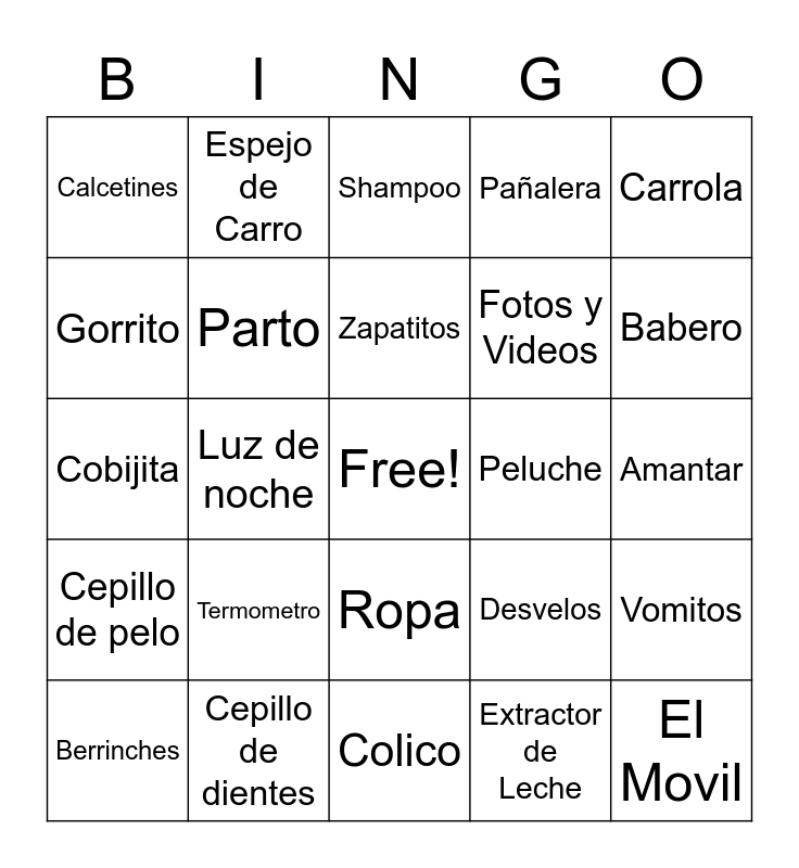 This bingo card has a free space and 79 words: Cuna, Porta bebé, Shampoo, Javon, Pachas, Chupete, Pañal, Andador, Hermanito, Papá, Mamá, Wipes, Pañalera, Calcetines, Guantes, Gorrito, Mesedora, Termometro, Formula, Amantar, Colostrum, Carrola, Cobijita, Zapatitos, Parto, Llanto, El cambiador, Bañera, Toalla, Cochecito, Babero, Mameluco, Colico, Juguetes, Berrinches, Peluche, Gatear, Libros, Cantar, El Movil, Vicks, Abuelos, Libros, Corral, Monitor de Video, Espejo de Carro, Saltador, Crema para Rozaduras, Bodies, Manta de Bebé, Vomitos, Luz de noche, Desvelos, Tylenol, Comida de Bebé, Hora de Siesta, Platos para bebé, Ultrasonido, Embarazo, Ropa, Fotos y Videos, Amor, Regalos, Cancion de cuna, Talcos, Travesuras, Sonrisas, Paciencia, Detergente de Bebé, Cepillo de pelo, Cepillo de dientes, Dolor de Dientes, Crema solar, Termo, Almohada para amamantar, Extractor de Leche, Gimnasio de Bebé, Botiquín and Felicidad.