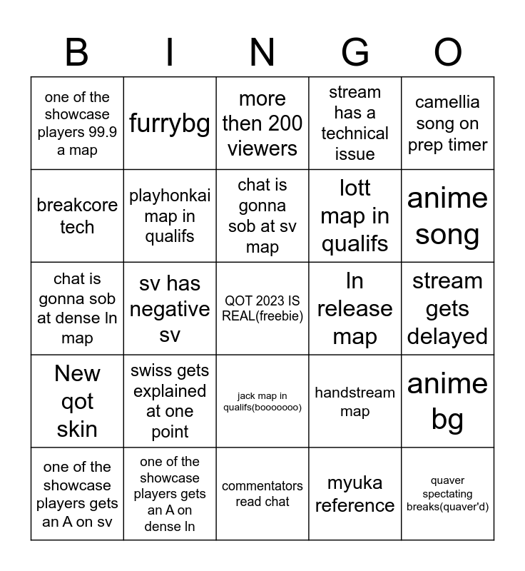 This bingo card has a free space and 24 words: swiss gets explained at one point, one of the showcase players gets an A on dense ln, chat is gonna sob at sv map, one of the showcase players gets an A on sv, camellia song on prep timer, one of the showcase players 99.9 a map, breakcore tech, furrybg, ln release map, jack map in qualifs(booooooo), lott map in qualifs, chat is gonna sob at dense ln map, handstream map, anime bg, playhonkai map in qualifs, myuka reference, stream gets delayed, more then 200 viewers, anime song, sv has negative sv, quaver spectating breaks(quaver'd), New qot skin, stream has a technical issue and commentators read chat.