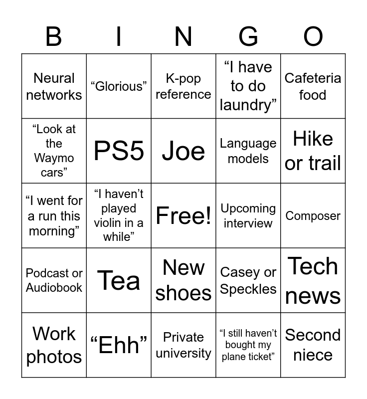 This bingo card has a free space and 24 words: Tea, “Ehh”, Joe, Work photos, Cafeteria food, Neural networks, “Look at the Waymo cars”, “Glorious”, Upcoming interview, New shoes, Language models, “I went for a run this morning”, Casey or Speckles, Tech news, PS5, “I still haven’t bought my plane ticket”, Composer, K-pop reference, Hike or trail, “I haven’t played violin in a while”, Second niece, Podcast or Audiobook, “I have to do laundry” and Private university.