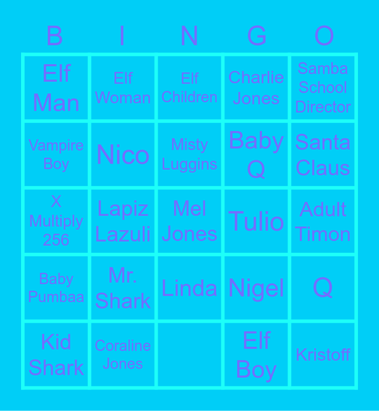 This bingo card has 25 words: Kid Shark, Mr. Shark, Misty Luggins, Elf Boy, Santa Claus, Elf Man, Elf Woman, Elf Children, Baby Q, Q, X Multiply 256, Nico, Nigel, Kristoff, Vampire Boy, Coraline Jones, Mel Jones, Charlie Jones, Adult Timon, Baby Pumbaa, Lapiz Lazuli, Linda, Tulio, Samba School Director and Big Baby.