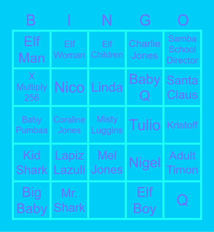 This bingo card has 25 words: Kid Shark, Mr. Shark, Misty Luggins, Elf Boy, Santa Claus, Elf Man, Elf Woman, Elf Children, Baby Q, Q, X Multiply 256, Nico, Mel Jones, Nigel, Kristoff, Vampire Boy, Coraline Jones, Linda, Charlie Jones, Adult Timon, Baby Pumbaa, Lapiz Lazuli, Tulio, Samba School Director and Big Baby.