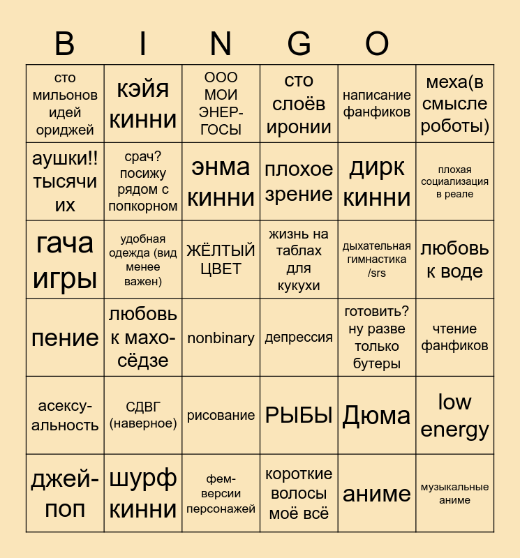 This bingo card has 36 words: РЫБЫ, рисование, короткие волосы моё всё, аушки!! тысячи их, пение, жизнь на таблах для кукухи, срач? посижу рядом с попкорном, фем-версии персонажей, написание фанфиков, Дюма, плохая социализация в реале, сто слоёв иронии, low energy, удобная одежда (вид менее важен), плохое зрение, сто мильонов идей ориджей, асексу- альность, дыхательная гимнастика /srs, гача игры, ООО МОИ ЭНЕР-ГОСЫ, ЖЁЛТЫЙ ЦВЕТ, любовь к махо-сёдзе, депрессия, nonbinary, готовить? ну разве только бутеры, кэйя кинни, дирк кинни, шурф кинни, энма кинни, меха(в смысле роботы), музыкальные аниме, джей-поп, чтение фанфиков, любовь к воде, СДВГ (наверное) and аниме.