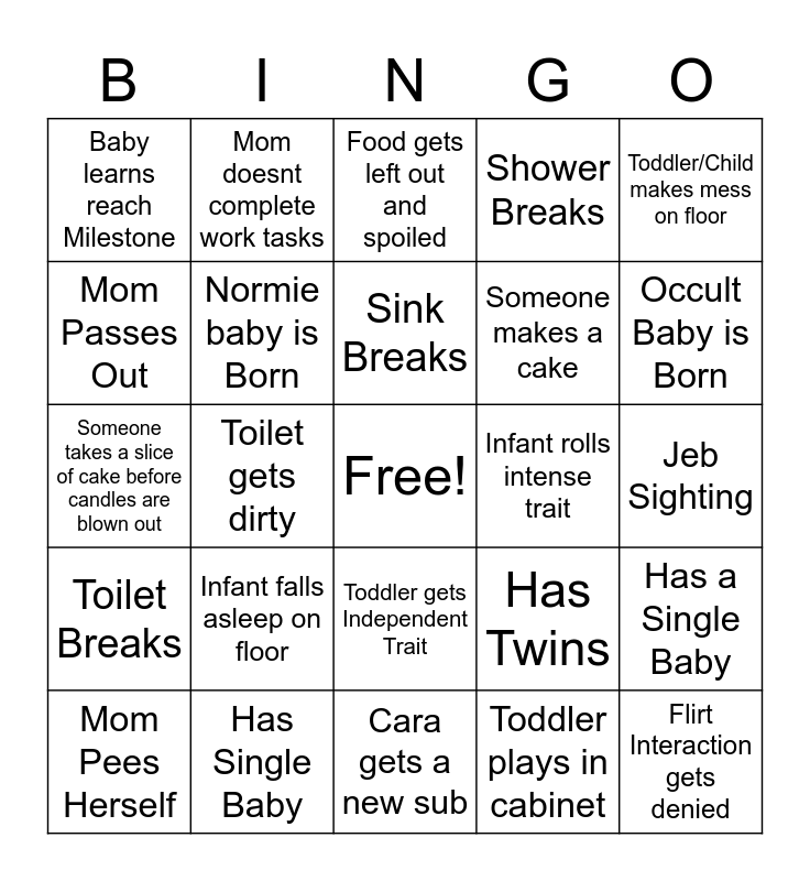 This bingo card has a free space and 24 words: Infant falls asleep on floor, Has Single Baby, Sink Breaks, Mom Pees Herself, Toddler/Child makes mess on floor, Baby learns reach Milestone, Mom Passes Out, Mom doesnt complete work tasks, Infant rolls intense trait, Toddler gets Independent Trait, Someone makes a cake, Someone takes a slice of cake before candles are blown out, Has Twins, Has a Single Baby, Normie baby is Born, Toddler plays in cabinet, Jeb Sighting, Food gets left out and spoiled, Occult Baby is Born, Toilet gets dirty, Flirt Interaction gets denied, Toilet Breaks, Shower Breaks and Cara gets a new sub.