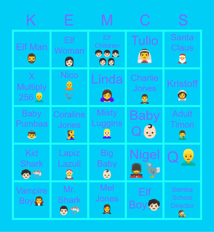 This bingo card has 25 words: Kid Shark🧒🏻🦈, Mr. Shark👨🏻🦈, Misty Luggins👱🏻♀️, Elf Boy🧒🏻, Santa Claus🎅, Elf Man🧔♂️, Elf Woman👩🏻, Elf Children 🧒🏻👦🏻👧🏻🧑🏻👩🏻, Baby Q👶🏻, Q👱♂️, X Multiply 256👱♂️, Nico🧑🦲🐦, Mel Jones🤵♀️, Nigel💂♂️🦤, Kristoff🧑🚀, Vampire Boy🧛, Coraline Jones🧏♀️, Linda🙇♀️, Charlie Jones🤵♂️, Adult Timon🤦♂️, Baby Pumbaa👼, Lapiz Lazuli🤶, Big Baby👶🏻, Tulio👰♂️ and Samba School Director🕵.
