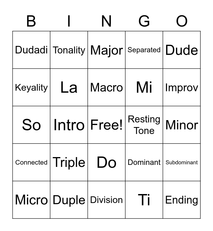 This bingo card has a free space and 24 words: Triple, Duple, Macro, Micro, Dude, Dudadi, Keyality, Tonality, Resting Tone, Do, Mi, So, Dominant, Subdominant, La, Ti, Minor, Major, Improv, Intro, Ending, Connected, Separated and Division.