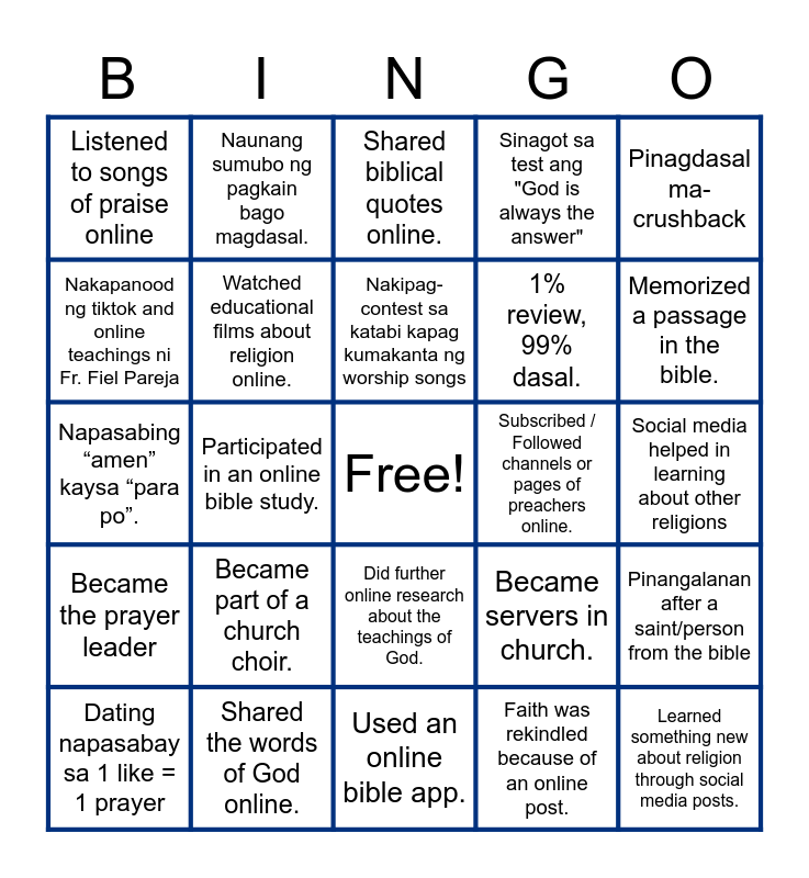 This bingo card has a free space and 30 words: Shared the words of God online., Attended online masses., Participated in an online bible study., Joined online church groups., Listened to songs of praise online, Shared biblical quotes online., Watched educational films about religion online., Did further online research about the teachings of God., Subscribed / Followed channels or pages of preachers online., Used an online bible app., Social media helped in learning about other religions, Learned something new about religion through social media posts., Faith was rekindled because of an online post., Prayed together with friends and family., Memorized a passage in the bible., Prayed before every meal, Became servers in church., Became the prayer leader, Became part of a church choir., Pinagdasal ma-crushback, Napasabing “amen” kaysa “para po”., Nakatulog habang nagdadasal., Naunang sumubo ng pagkain bago magdasal., 1% review, 99% dasal., Nakapanood ng tiktok and online teachings ni Fr. Fiel Pareja, Sinagot sa test ang "God is always the answer", Pinangalanan after a saint/person from the bible, Dating napasabay sa 1 like = 1 prayer, Nakipag-contest sa katabi kapag kumakanta ng worship songs and Sinipag magsimba nung ka-churchmate si crush.