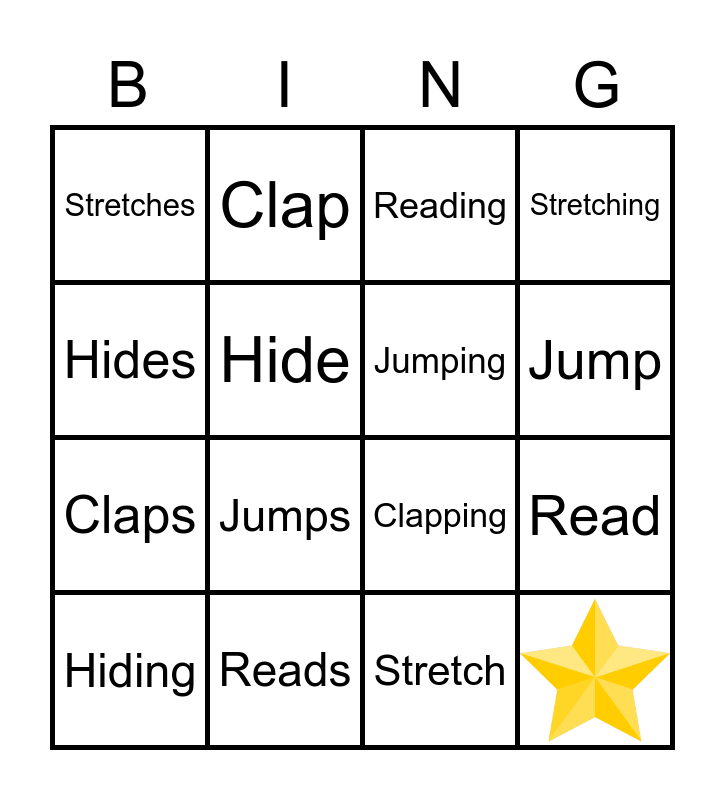 This bingo card has 1 images and 15 words: Reads, Read, Reading, Stretches, Claps, Clap, Clapping, Stretch, Hides, Hide, Hiding, Stretching, Jumps, Jump and Jumping.