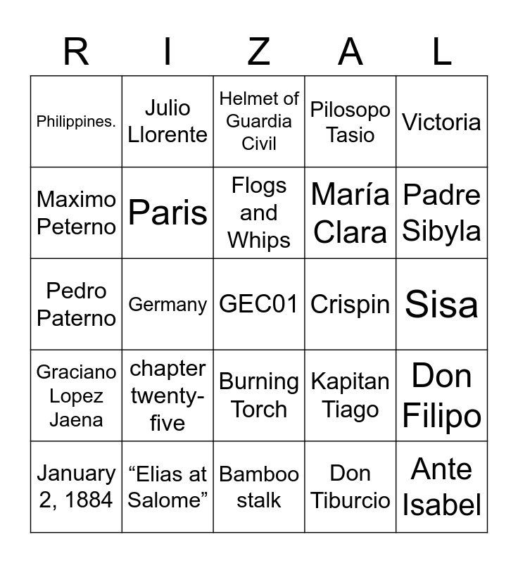 This bingo card has a free space and 24 words: January 2, 1884, chapter twenty-five, Flogs and Whips, Don Tiburcio, Victoria, Philippines., Julio Llorente, Helmet of Guardia Civil, Crispin, Sisa, Pedro Paterno, Paris, Kapitan Tiago, Don Filipo, Maximo Peterno, “Elias at Salome”, Bamboo stalk, Pilosopo Tasio, Padre Sibyla, Graciano Lopez Jaena, Germany, Burning Torch, María Clara and Ante Isabel.