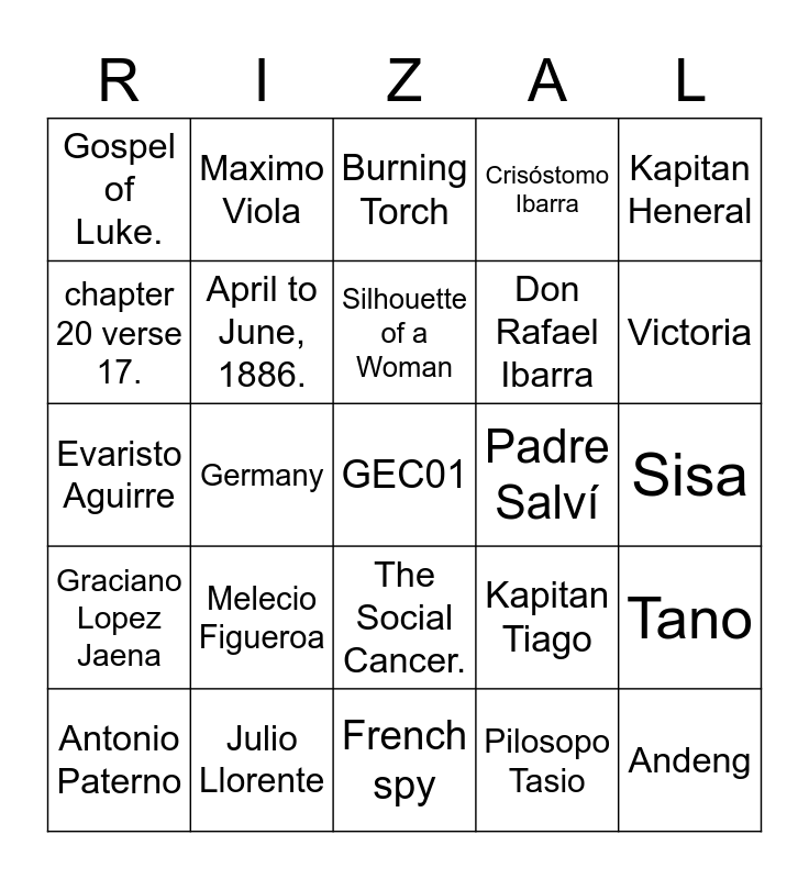 This bingo card has a free space and 24 words: Antonio Paterno, Melecio Figueroa, Silhouette of a Woman, Pilosopo Tasio, Kapitan Heneral, Gospel of Luke., Maximo Viola, Burning Torch, Padre Salví, Sisa, Evaristo Aguirre, April to June, 1886., Kapitan Tiago, Tano, chapter 20 verse 17., Julio Llorente, French spy, Crisóstomo Ibarra, Victoria, Graciano Lopez Jaena, Germany, The Social Cancer., Don Rafael Ibarra and Andeng.