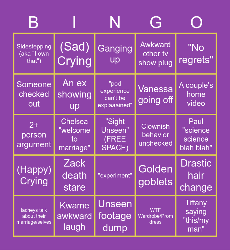 This bingo card has a free space and 28 words: Drastic hair change, Absent contestant, Vanessa going off, WTF Wardrobe/Prom dress, Someone checked out, Ganging up, (Sad) Crying, (Happy) Crying, Clownish behavior unchecked, lacheys talk about their marriage/selves, 2+ person argument, Awkward other tv show plug, Kwame awkward laugh, Unseen footage dump, A couple's home video, A Lachey reading a mean tweet, Zack death stare, An ex showing up, "pod experience can't be explaaained", "experiment", Sidestepping (aka "I own that"), Someone broke up, Tiffany saying "this/my man", Chelsea "welcome to marriage", Paul "science science blah blah", Golden goblets, "No regrets" and Secret revealed.
