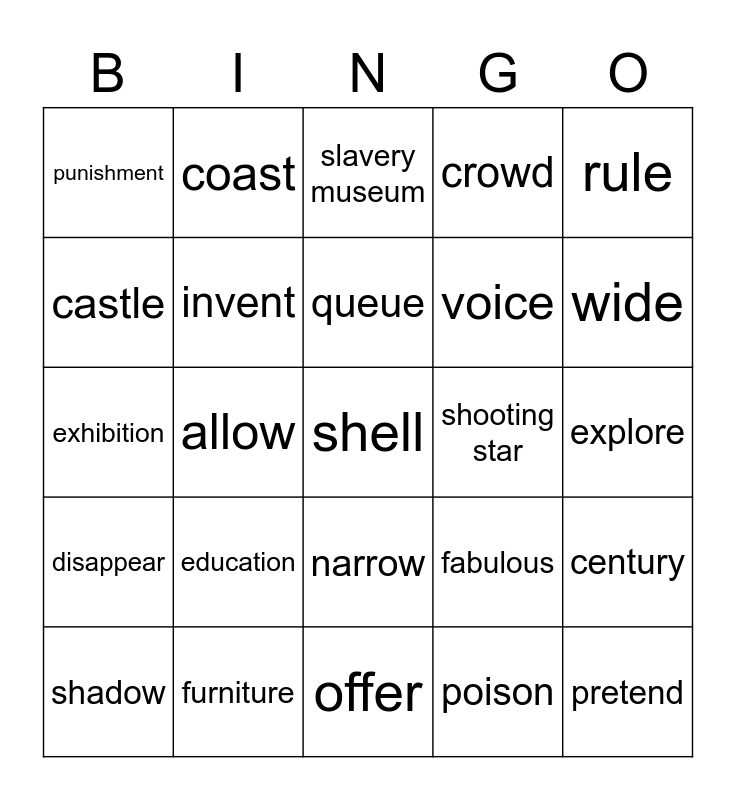 This bingo card has a free space and 24 words: education, furniture, queue, shadow, rule, punishment, castle, coast, shooting star, narrow, voice, exhibition, fabulous, century, invent, poison, explore, slavery museum, wide, allow, pretend, disappear, crowd and offer.