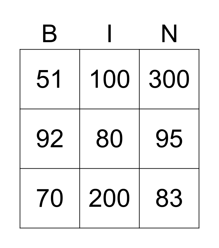 This bingo card has 33 words: 30, 40, 50, 60, Free!, 70, 80, 90, 100, 101, 200, 300, 400, 500, 600, 700, 800, 900, 20, 23, 34, 43, 51, 67, 76, 88, 92, 83, 95, 66, 57, 48 and 31.