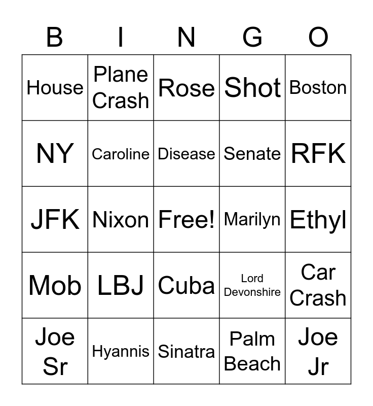 This bingo card has a free space and 29 words: Joe Sr, John John, Nixon, Ted, House, Rose, Caroline, LBJ, Marilyn, Hyannis, Ethyl, Joe Jr, Sinatra, Palm Beach, RFK, Kick, Cuba, Mob, Boston, JFK, Lord Devonshire, Jackie, Senate, NY, Shot, Plane Crash, Car Crash, Disease and Moon.