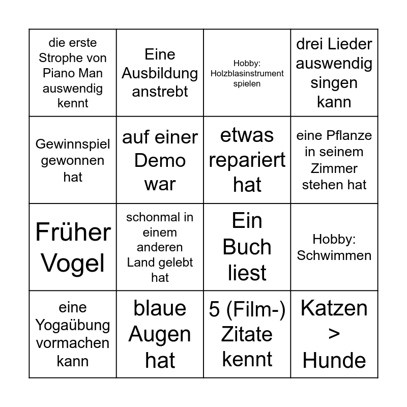 This bingo card has 16 words: blaue Augen hat, Hobby: Schwimmen, Hobby: Holzblasinstrument spielen, die erste Strophe von Piano Man auswendig kennt, Früher Vogel, Eine Ausbildung anstrebt, Ein Buch liest, 5 (Film-) Zitate kennt, Gewinnspiel gewonnen hat, auf einer Demo war, eine Yogaübung vormachen kann, drei Lieder auswendig singen kann, schonmal in einem anderen Land gelebt hat, eine Pflanze in seinem Zimmer stehen hat, etwas repariert hat and Katzen > Hunde.