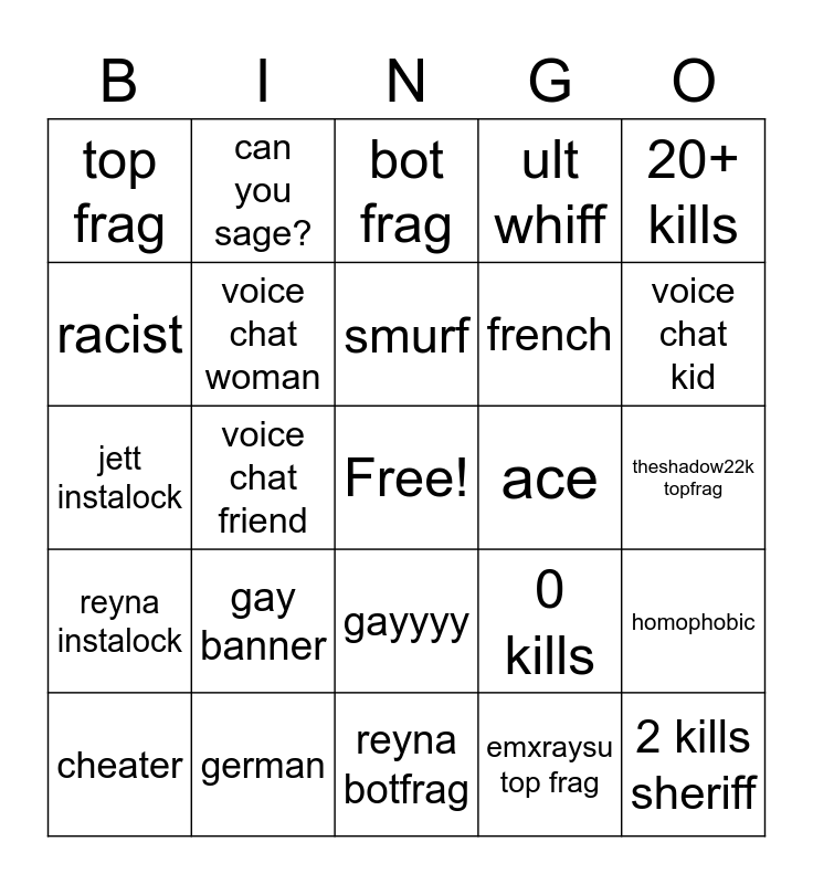 This bingo card has a free space and 24 words: gay banner, german, smurf, cheater, 20+ kills, top frag, racist, can you sage?, ace, gayyyy, french, jett instalock, 0 kills, homophobic, voice chat woman, emxraysu top frag, theshadow22k topfrag, bot frag, voice chat kid, voice chat friend, 2 kills sheriff, reyna instalock, ult whiff and reyna botfrag.