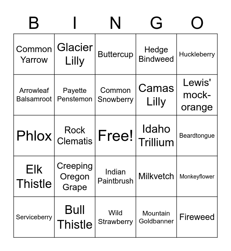 This bingo card has a free space and 24 words: Creeping Oregon Grape, Bull Thistle, Common Snowberry, Serviceberry, Huckleberry, Common Yarrow, Arrowleaf Balsamroot, Glacier Lilly, Idaho Trillium, Indian Paintbrush, Camas Lilly, Phlox, Milkvetch, Monkeyflower, Payette Penstemon, Mountain Goldbanner, Beardtongue, Buttercup, Lewis' mock-orange, Rock Clematis, Fireweed, Elk Thistle, Hedge Bindweed and Wild Strawberry.