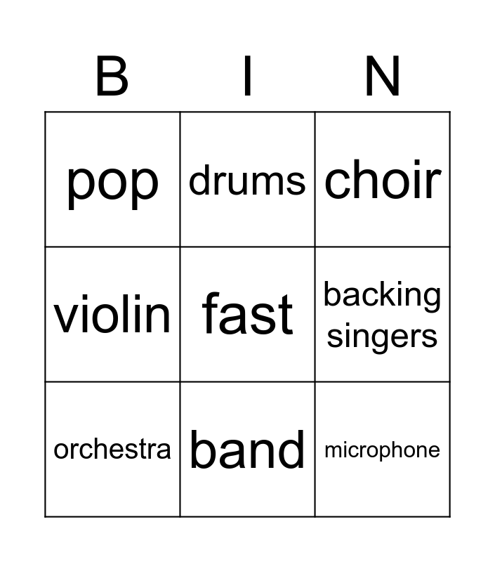 This bingo card has a free space and 12 words: Singer, guitar, microphone, backing singers, drums, choir, band, orchestra, pop, violin, orchestra and slow.