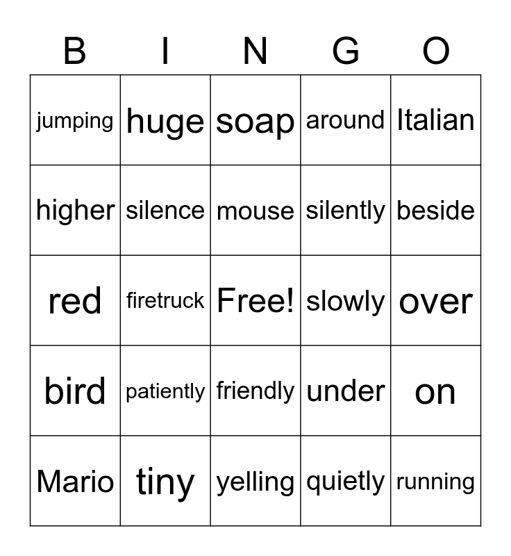 This bingo card has a free space and 24 words: patiently, tiny, mouse, Mario, Italian, jumping, higher, huge, slowly, friendly, silently, red, under, on, silence, quietly, over, soap, beside, firetruck, running, bird, around and yelling.