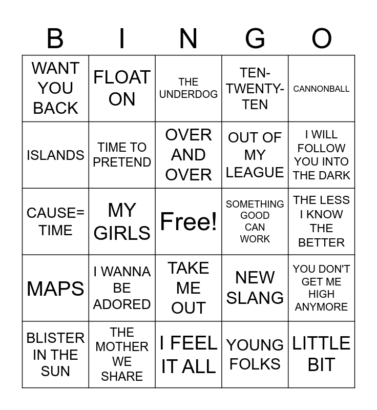 This bingo card has a free space and 33 words: ALL MY FRIENDS, MIDNIGHT CITY, MY GIRLS, WOLF LIKE ME, MAPS, TIME TO PRETEND, CANNONBALL, BLISTER IN THE SUN, FLOAT ON, THE SUBURBS, OVER AND OVER, THE UNDERDOG, SOME NIGHTS, HOUDINI, SOMETHING GOOD CAN WORK, I WILL FOLLOW YOU INTO THE DARK, THE MOTHER WE SHARE, CAUSE= TIME, I WANNA BE ADORED, NEW SLANG, TAKE ME OUT, WAY IT GOES, WANT YOU BACK, THE LESS I KNOW THE BETTER, I FEEL IT ALL, LITTLE BIT, TEN-TWENTY-TEN, OUT OF MY LEAGUE, ISLANDS, YOU DON'T GET ME HIGH ANYMORE, SLEEPYHEAD, YOUNG FOLKS and EVERYTHING IS EVERYTHING.
