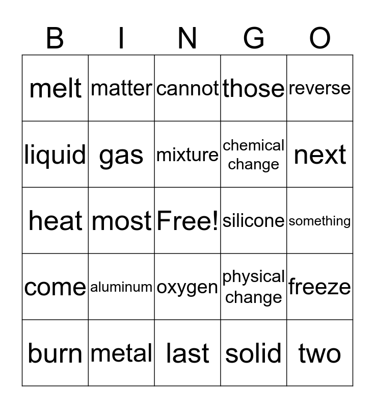 This bingo card has a free space and 24 words: aluminum, metal, mixture, burn, reverse, melt, liquid, matter, silicone, oxygen, chemical change, heat, physical change, freeze, gas, solid, something, cannot, next, most, two, come, those and last.