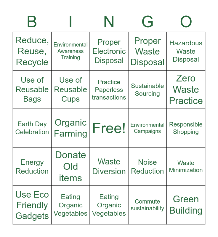 This bingo card has a free space and 24 words: Donate Old items, Eating Organic Vegetables, Practice Paperless transactions, Use Eco Friendly Gadgets, Hazardous Waste Disposal, Reduce, Reuse, Recycle, Use of Reusable Bags, Environmental Awareness Training, Environmental Campaigns, Waste Diversion, Sustainable Sourcing, Earth Day Celebration, Noise Reduction, Waste Minimization, Use of Reusable Cups, Commute sustainability, Responsible Shopping, Proper Electronic Disposal, Zero Waste Practice, Organic Farming, Green Building, Energy Reduction, Proper Waste Disposal and Eating Organic Vegetables.