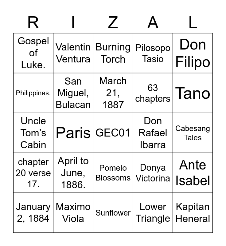 This bingo card has a free space and 24 words: January 2, 1884, April to June, 1886., March 21, 1887, Lower Triangle, Don Filipo, Gospel of Luke., Valentin Ventura, Burning Torch, Don Rafael Ibarra, Cabesang Tales, Uncle Tom’s Cabin, San Miguel, Bulacan, Donya Victorina, Ante Isabel, Philippines., Maximo Viola, Sunflower, Pilosopo Tasio, Tano, chapter 20 verse 17., Paris, Pomelo Blossoms, 63 chapters and Kapitan Heneral.