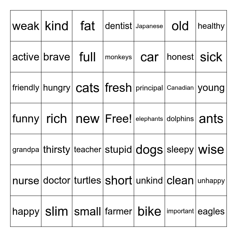 This bingo card has a free space and 84 words: tall, short, fat, slim, handsome, ugly, doctor, cook, nurse, farmer, scientist, vet, healthy, sick, strong, weak, young, old, smart, stupid, wise, brave, honest, sensitive, car, train, bike, airplane, helicopter, ship, cats, bears, dogs, monkeys, eagles, dolphins, rich, poor, full, hungry, thirsty, sleepy, lucky, unlucky, happy, unhappy, kind, unkind, singer, pilot, teacher, principal, dentist, artist, loud, quiet, funny, active, polite, friendly, son, father, uncle, brother, husband, grandpa, Korean, American, Japanese, Chinese, Canadian, German, clean, dirty, fresh, new, simple, important, big, ants, elephants, small, turtles and fast.