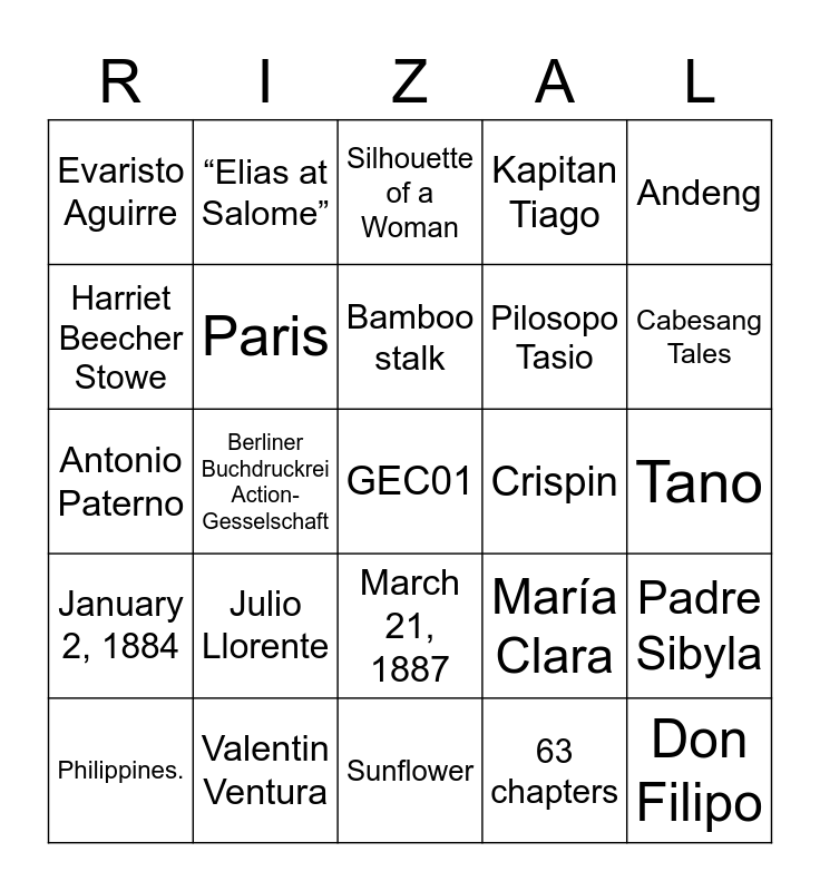 This bingo card has a free space and 24 words: Philippines., Julio Llorente, Bamboo stalk, 63 chapters, Andeng, Evaristo Aguirre, “Elias at Salome”, Silhouette of a Woman, Crispin, Tano, Antonio Paterno, Paris, María Clara, Padre Sibyla, Harriet Beecher Stowe, Valentin Ventura, Sunflower, Kapitan Tiago, Cabesang Tales, January 2, 1884, Berliner Buchdruckrei Action-Gesselschaft, March 21, 1887, Pilosopo Tasio and Don Filipo.