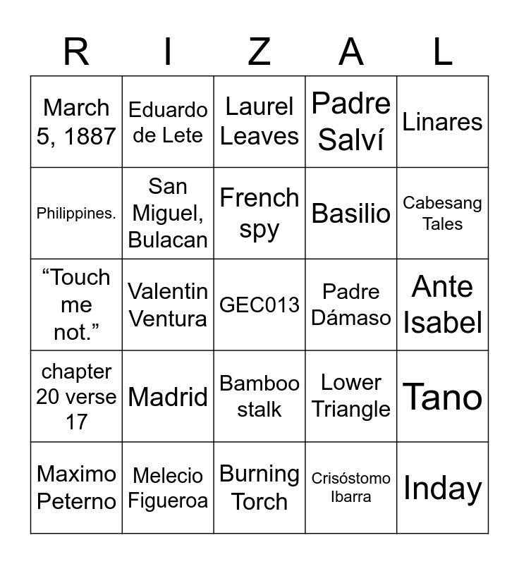 This bingo card has a free space and 24 words: Maximo Peterno, Madrid, French spy, Crisóstomo Ibarra, Linares, March 5, 1887, Eduardo de Lete, Laurel Leaves, Padre Dámaso, Ante Isabel, “Touch me not.”, San Miguel, Bulacan, Lower Triangle, Tano, Philippines., Melecio Figueroa, Burning Torch, Padre Salví, Cabesang Tales, chapter 20 verse 17, Valentin Ventura, Bamboo stalk, Basilio and Inday.