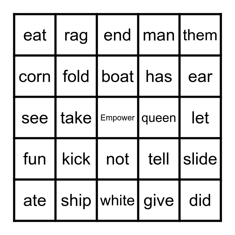 This bingo card has a free space and 72 words: made, rag, take, talk, am, name, man, and, has, cat, ate, gave, ear, eat, red, see, tell, them, yes, let, kick, did, slide, like, will, him, time, in, find, king, ship, this, wish, dive, give, dog, cop, for, corn, nose, not, cow, down, boy, bug, fun, bus, nut, food, champ, nap, test, sink, queen, luck, pig, end, boat, fool, pack, mask, file, jump, white, look, wife, fold, ten, vine, use, shark and smart.