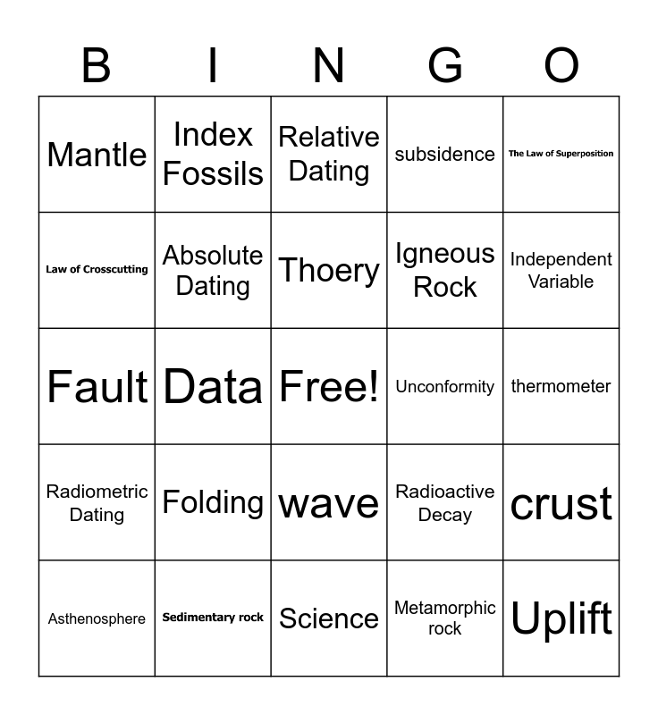 This bingo card has 3 images, a free space and 21 words: Folding, Thoery, Asthenosphere, Mantle, Index Fossils, Unconformity, wave, Igneous Rock, Fault, Radioactive Decay, crust, Absolute Dating, Metamorphic rock, thermometer, Relative Dating, Independent Variable, Data, Uplift, Radiometric Dating, subsidence and Science.
