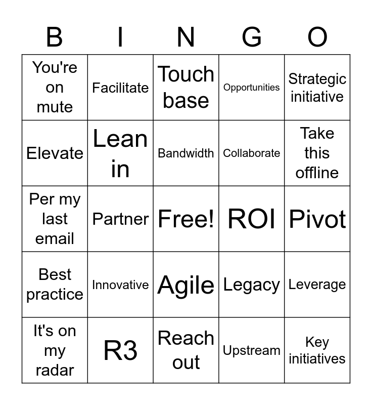 This bingo card has a free space and 24 words: Innovative, R3, Bandwidth, It's on my radar, Strategic initiative, You're on mute, Elevate, Facilitate, ROI, Agile, Collaborate, Per my last email, Legacy, Leverage, Lean in, Upstream, Pivot, Touch base, Take this offline, Partner, Key initiatives, Best practice, Opportunities and Reach out.