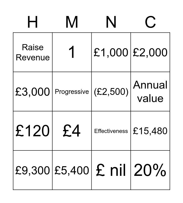 This bingo card has 32 words: £5,692, Efficiency, £15,480, £37,300, 20%, (£2,500), £3,000, £100, 1, £6,570, Annual value, £1,000, 38.1%, £150,000, £5,400, 4%, £900, Effectiveness, Origin, Tax avoidance, 0, £1,360, £ nil, £814, £9,300, £2,000, £120, Progressive, Raise Revenue, 2, 183 and £4.