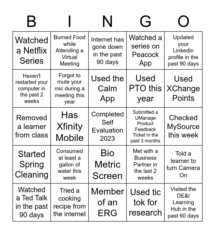 This bingo card has 25 words: Consumed at least a gallon of water this week, Member of an ERG, Used the Calm App, Watched a Ted Talk in the past 90 days, Updated your Linkedin profile in the past 90 days, Watched a Netflix Series, Haven't restarted your computer in the past 2 weeks, Burned Food while Attending a Virtual Meeting, Submitted a UManage Product Feedback Ticket in the past 3 months, Bio Metric Screen, Used PTO this year, Removed a learner from class, Met with a Business Partner in the last 2 weeks, Told a learner to turn Camera On, Forgot to mute your mic during a meeting this year, Visited the DE&I Learning Hub in the past 60 days, Checked MySource this week, Internet has gone down in the past 90 days, Used XChange Points, Has Xfinity Mobile, Completed Self Evaluation 2023, Tried a cooking recipe from the internet, Started Spring Cleaning, Watched a series on Peacock App and Used tic tok for research.