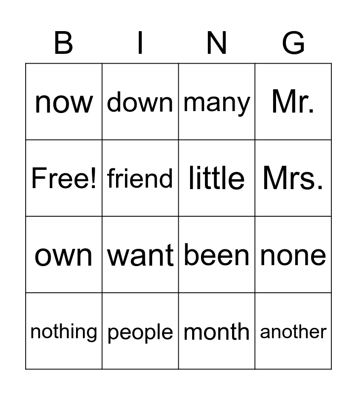 This bingo card has 16 words: people, none, many, now, own, down, been, month, Free!, friend, nothing, Mr., want, Mrs., little and another.