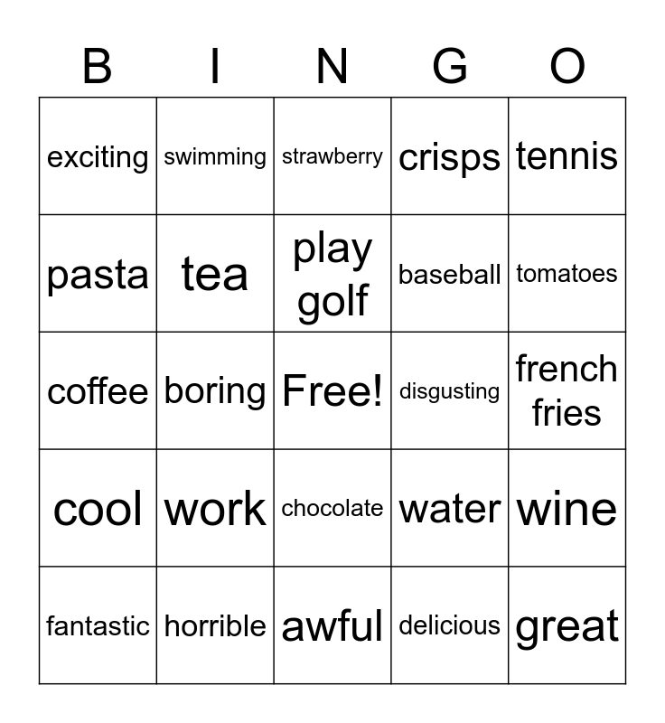 This bingo card has a free space and 24 words: work, horrible, play golf, fantastic, tennis, exciting, pasta, swimming, disgusting, chocolate, baseball, coffee, water, wine, tea, delicious, french fries, strawberry, tomatoes, boring, great, cool, crisps and awful.