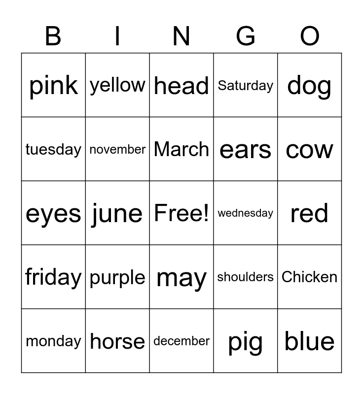 This bingo card has a free space and 29 words: monday, nose, june, cat, pink, head, november, purple, wednesday, horse, red, blue, december, pig, cow, orange, may, friday, dog, eyes, shoulders, brown, ears, tuesday, Saturday, yellow, Chicken, March and mouth.