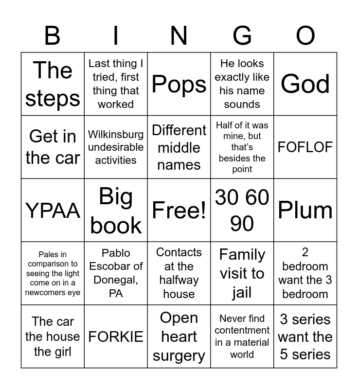 This bingo card has a free space and 24 words: Pablo Escobar of Donegal, PA, FORKIE, Different middle names, The car the house the girl, God, The steps, Get in the car, Last thing I tried, first thing that worked, 30 60 90, Contacts at the halfway house, Half of it was mine, but that’s besides the point, YPAA, Family visit to jail, 2 bedroom want the 3 bedroom, Wilkinsburg undesirable activities, Never find contentment in a material world, Plum, Pops, FOFLOF, Big book, 3 series want the 5 series, Pales in comparison to seeing the light come on in a newcomers eye, He looks exactly like his name sounds and Open heart surgery.