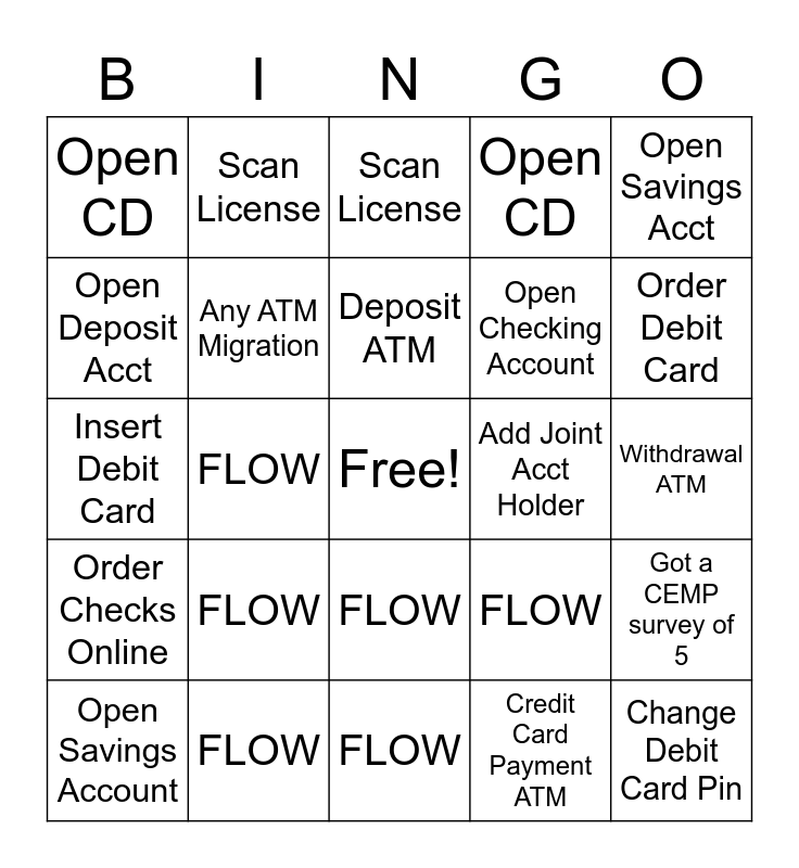 This bingo card has a free space and 26 words: FLOW, Credit Card Payment ATM, Deposit ATM, FLOW, Open Savings Acct, Open CD, Open Deposit Acct, Scan License, Withdrawal ATM, FLOW, Open Checking Account, Insert Debit Card, Got a CEMP survey of 5, Open Savings Account, FLOW, Tell someone "Have a great day! (Dani voice), Open CD, Order Checks Online, Scan License, Change Debit Card Pin, Order Debit Card, FLOW, Add Joint Acct Holder, FLOW, Any ATM Migration and Increase ATM limit.