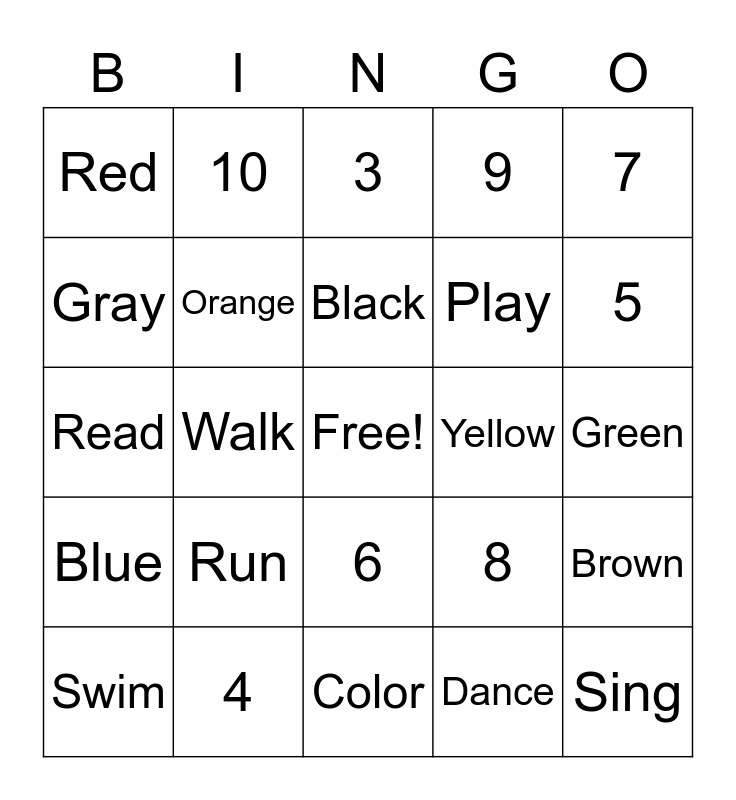 This bingo card has a free space and 29 words: Swim, 1, Walk, 2, Red, 3, Orange, Run, Yellow, 4, Green, Sing, Color, Dance, 5, Sleep, 6, Blue, 7, Read, 8, Purple, Play, Gray, 9, 10, Brown, Black and White.
