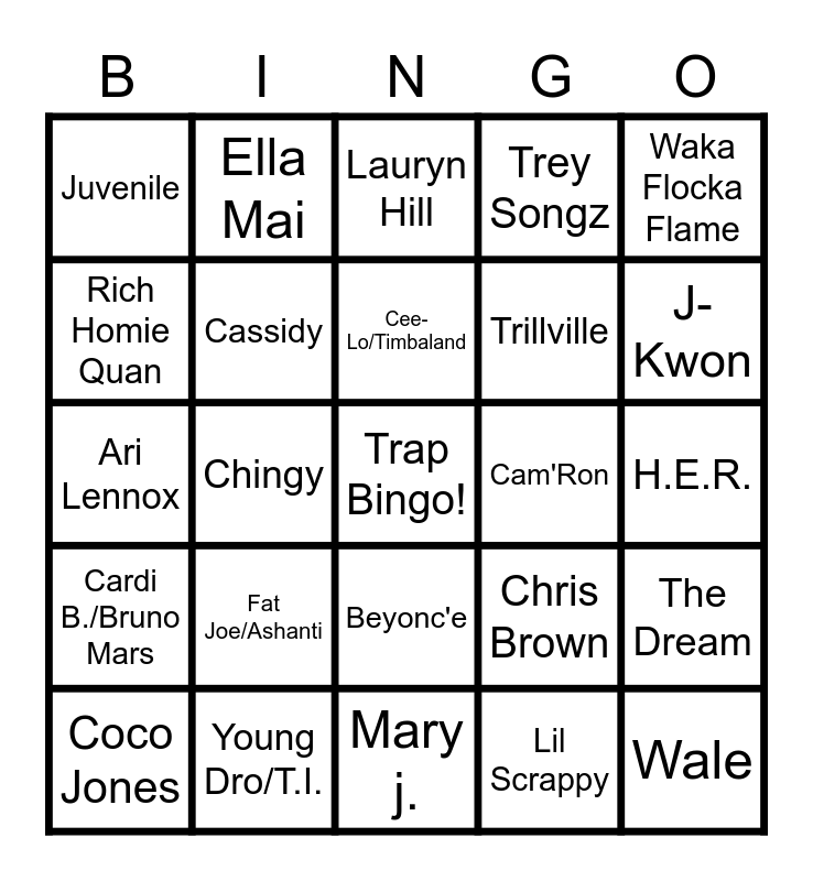 This bingo card has a free space and 24 words: Fat Joe/Ashanti, Young Dro/T.I., Cee-Lo/Timbaland, Coco Jones, Waka Flocka Flame, Juvenile, Rich Homie Quan, Ella Mai, Cam'Ron, Beyonc'e, Trillville, Ari Lennox, Chris Brown, The Dream, Cassidy, Lil Scrappy, H.E.R., Lauryn Hill, J-Kwon, Chingy, Wale, Cardi B./Bruno Mars, Trey Songz and Mary j..