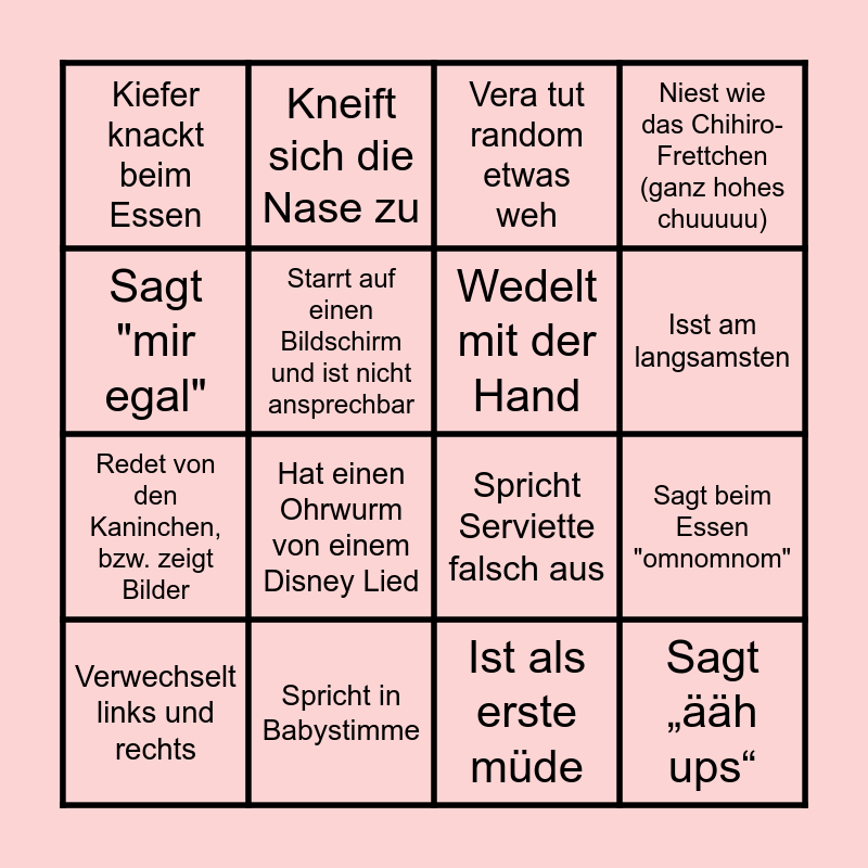 This bingo card has 16 words: Verwechselt links und rechts, Spricht in Babystimme, Vera tut random etwas weh, Niest wie das Chihiro-Frettchen (ganz hohes chuuuuu), Sagt "mir egal", Kneift sich die Nase zu, Spricht Serviette falsch aus, Sagt beim Essen "omnomnom", Kiefer knackt beim Essen, Starrt auf einen Bildschirm und ist nicht ansprechbar, Ist als erste müde, Isst am langsamsten, Redet von den Kaninchen, bzw. zeigt Bilder, Hat einen Ohrwurm von einem Disney Lied, Wedelt mit der Hand and Sagt „ääh ups“.