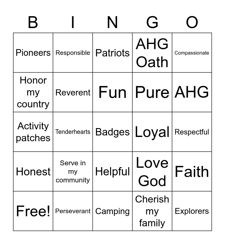 This bingo card has 29 words: Free!, Pathfinders, Tenderhearts, Explorers, Pioneers, Patriots, Reverent, Serve in my community, Loyal, Perseverant, Respectful, Badges, Camping, Cherish my family, AHG, Resourceful, Helpful, Honest, Compassionate, Activity patches, Love God, AHG Creed, Pure, Honor my country, AHG Oath, Responsible, Faith, Fun and Integrity.