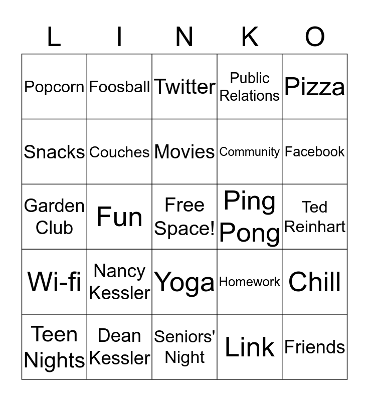 This bingo card has a free space and 24 words: Nancy Kessler, Dean Kessler, Movies, Teen Nights, Pizza, Popcorn, Snacks, Foosball, Ping Pong, Yoga, Community, Garden Club, Homework, Chill, Couches, Link, Ted Reinhart, Twitter, Facebook, Fun, Friends, Wi-fi, Public Relations and Seniors' Night.